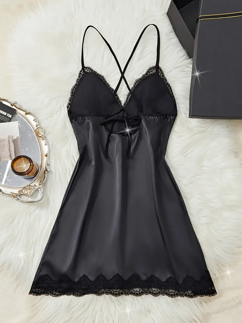 艶めくブラックサテン♡ レーストリム キャミソールランジェリー【Mサイズ】